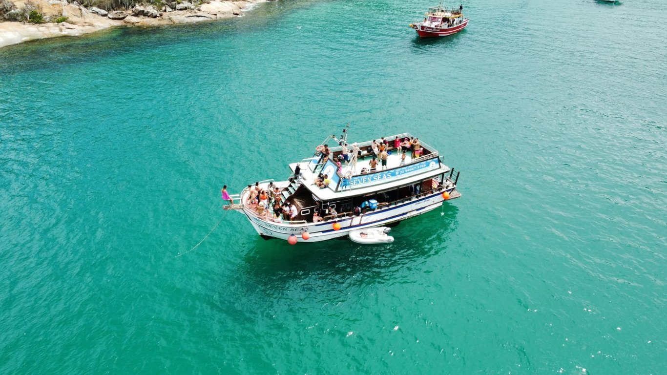 O tour inclui um emocionante passeio de barco pelas águas cristalinas de Arraial do Cabo, proporcionando uma vista única da costa e das praias da região.